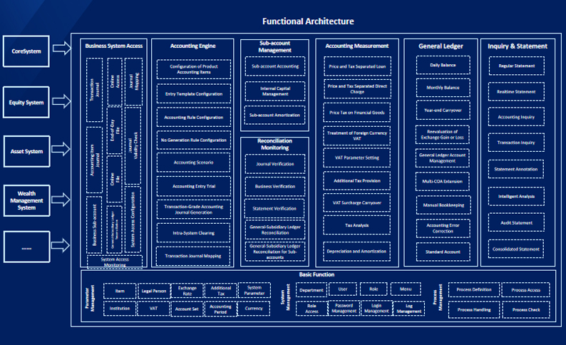 The next-generation distributed transaction-grade general ledger (including accounting engine), with its distributed, microservices architecture, satisfies the needs of business scenarios featuring high concurrency, high data volume, and requiring high efficiency and flexibility, and supports billion-scale account processing and daily trading volume, By supporting open source middleware and distributed databases, the solution meets the bank’s needs for independent and controllable key core application systems.