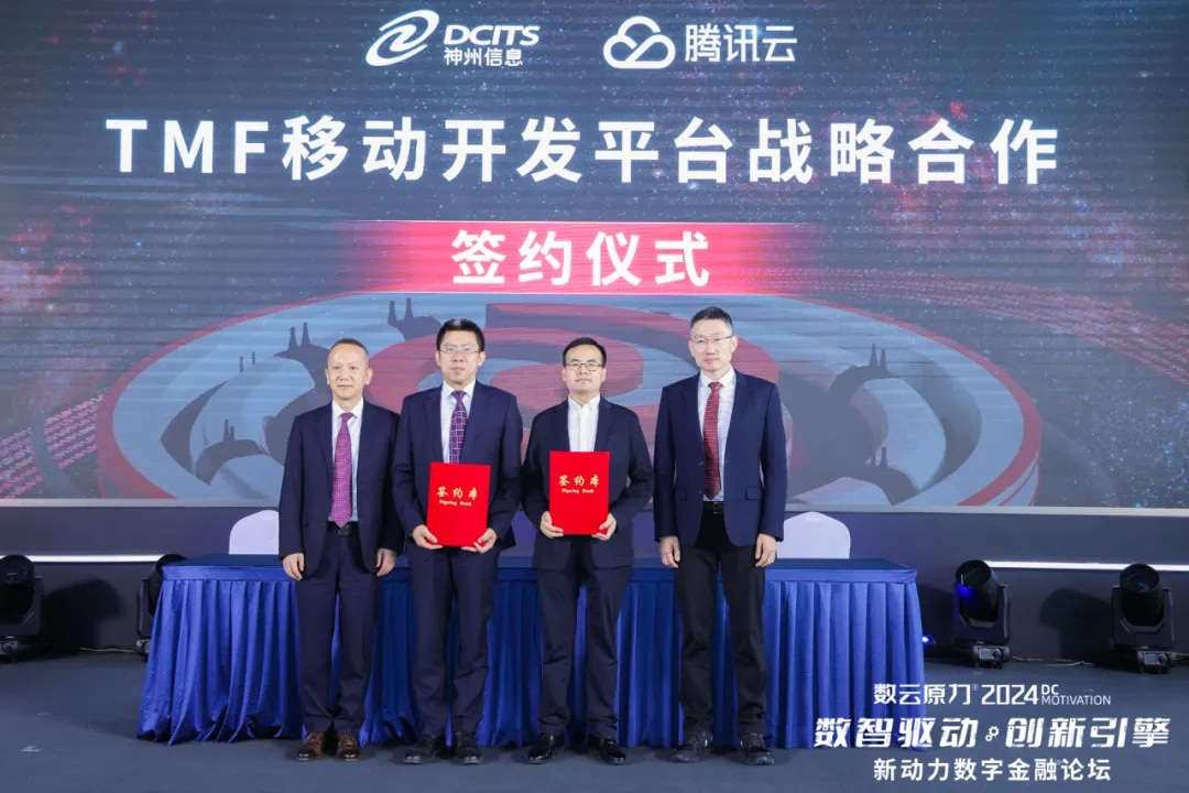 現場還舉行了兩場簽約儀式。在神州信息與騰訊云“TMF 移動開發平臺戰略合作簽約”儀式上,神州信息常務副總裁于宏志、騰訊云副總裁胡利明代表雙方簽署協議,神州信息總裁李鴻春、騰訊云總裁邱躍鵬共同見證簽約。本次簽約后,神州信息成為騰訊云TMF金融領域獨家授權伙伴,可借助TMF平臺功能進行定制化開發,滿足客戶需求,彌補移動開發短板。