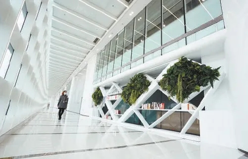 “懷舊”為的是更好地向前看。二層150米雙層挑高景觀文化長廊,氣勢恢宏。外邊是北京動物園,可以欣賞四季景觀。屋頂采用全玻璃吊頂,夜間照明時有銀河的感覺。長廊計劃長期進行文化藝術品布展,將被打造為金融科技與文化藝術結合的休閑場所。