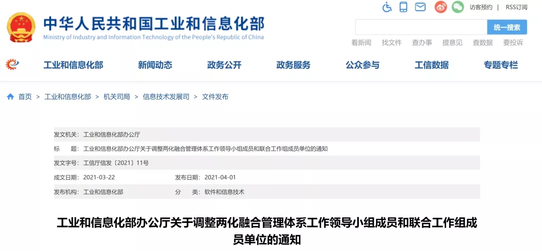 工業和信息化部辦公廳今天發布《關于調整兩化融合管理體系工作領導小組成員和聯合工作組成員單位的通知》,根據工作需要和人員變動情況,對兩化融合管理體系工作領導小組成員和聯合工作組成員單位進行調整。通知明確,兩化融合管理體系工作領導小組組長為工業和信息化部黨組書記、部長肖亞慶。聯合工作組秘書處設在國家工業信息安全發展研究中心(工業和信息化部電子第一研究所),神州信息成為工業和信息化部兩化融合管理體系聯合工作組成員單位。