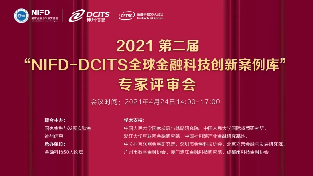 4月24日,2021第二屆“NIFD-DCITS全球金融科技創新案例庫” 專家評審會在京舉辦。會議由國家金融與發展實驗室和神州信息聯合主辦,金融科技50人論壇承辦。中國人民大學國家發展與戰略研究院、中國人民大學國際貨幣研究所、浙江大學互聯網金融研究院、中國社科院產業金融研究基地、中關村互聯網金融研究院、深圳市金融科技協會、北京立言金融與發展研究院、廣州市數字金融協會、廈門鷺江金融科技研究院等提供學術支持。