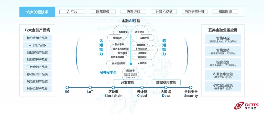 一直以來,AI能力建設都是各金融機構戰略布局的重點關注方向。此次神州信息推出金融超腦Sm@rtFSB便是針對AI技術垂直領域的新產品。作為一款企業級的金融AI中臺解決方案,金融超腦Sm@rtFSB可基于人工智能前沿、大數據、云計算及區塊鏈等底層技術,為金融機構提供智能營銷、智能風控、智能運營、農業普惠金融、小微企業融資等一整套AI能力體系。其整體技術架構按照“一基一核兩翼”整體研發路標進行搭建,主要由金融AI開發平臺、感知能力平臺、認知能力平臺三個核心模塊構成。