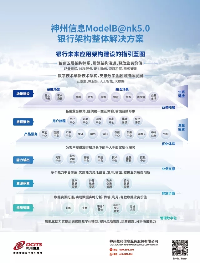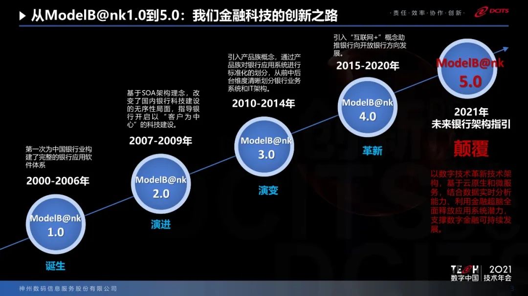 在中國銀行業(yè)40余年的科技創(chuàng)新發(fā)展歷程中,神州信息通過發(fā)布5代ModelB@nk銀行架構(gòu)整體解決方案,始終指引中國銀行業(yè)的IT架構(gòu)整體設(shè)計(jì)和規(guī)劃。神州信息是國內(nèi)最早從事整體IT架構(gòu)研究的金融科技廠商,ModelB@nk1.0于2000年初始發(fā)布,到2015年演進(jìn)到了4.0版本。來到2021年,歷經(jīng)六年打磨規(guī)劃的5.0版本積極擁抱金融數(shù)字化發(fā)展新趨勢(shì),通過對(duì)未來IT架構(gòu)的整體規(guī)劃設(shè)計(jì),幫助銀行建立符合自身特點(diǎn)的以及信創(chuàng)要求的技術(shù)和應(yīng)用體系,助力業(yè)務(wù)快速發(fā)展與安全運(yùn)行。