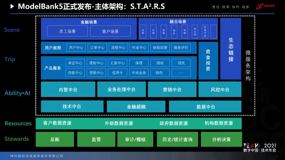 國家提出的信創(chuàng)工程,今年有120家銀行單位參與到信創(chuàng)的試點(diǎn)當(dāng)中,也為我們提出了新的命題,就是如何保證在科技架構(gòu)下保障國家安全體系的建設(shè)。基于科技的變化以及銀行業(yè)的變化,我們推出了ModelB@nk5.0。