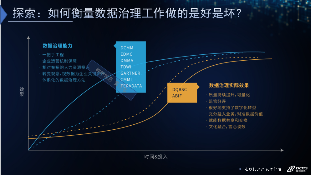 從能力和實際資產(chǎn)情況兩個維度就可以很好地來評估數(shù)據(jù)治理的效果。像國標的DCMM數(shù)據(jù)管理成熟度評估是在衡量數(shù)據(jù)治理能力,而數(shù)據(jù)質(zhì)量平衡記分卡則是在衡量數(shù)據(jù)質(zhì)量的實際情況。兩者合一,都可以較好地說清楚數(shù)據(jù)治理的效果。
