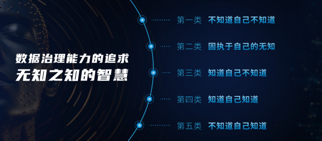 第五類是不知道自己知道,是最高境界,數(shù)據(jù)治理領(lǐng)域有非常深的造詣,同時敬畏謙卑,無知勝有知。