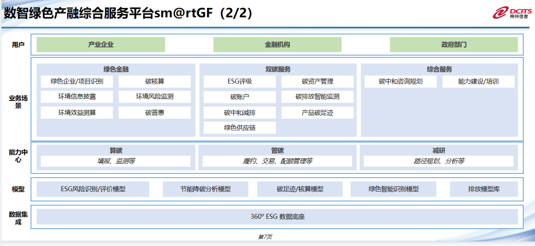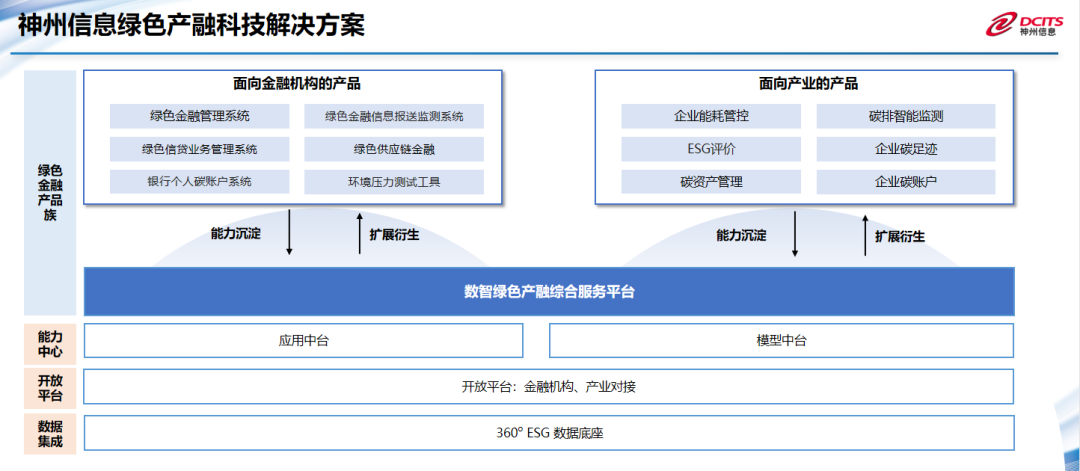 · 2大擴(kuò)展:綠色金融產(chǎn)品族、綠色產(chǎn)業(yè)產(chǎn)品族,面向金融機(jī)構(gòu)和產(chǎn)業(yè)機(jī)構(gòu)提供綠色識(shí)別、環(huán)境效益監(jiān)測(cè)、碳核算、碳資產(chǎn)管理等專業(yè)的綠色環(huán)境相關(guān)服務(wù)
