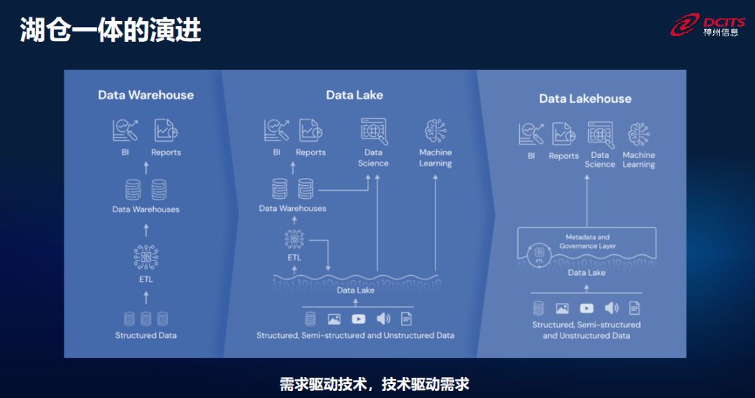 需要說明的是,這張圖來自國外,圖里沒有出現數據倉庫,這并不是說數據倉庫消失了。當我們說數據倉庫、數據湖的時候,其實有兩種說法,一種說法是指硬件平臺,一種說法是指數據的組織結構。這張圖里說的是硬件平臺,指的是用一個硬件平臺來實現湖和倉的建設,也被認為是真正的湖倉一體。
