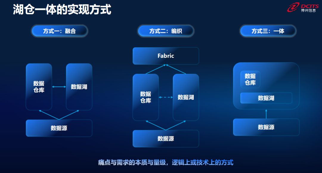 接下來,我們來看一下國內建設湖倉一體的幾種方式。方式一和方式二我們可以認為是邏輯上的一體,方式三是平臺級的一體。