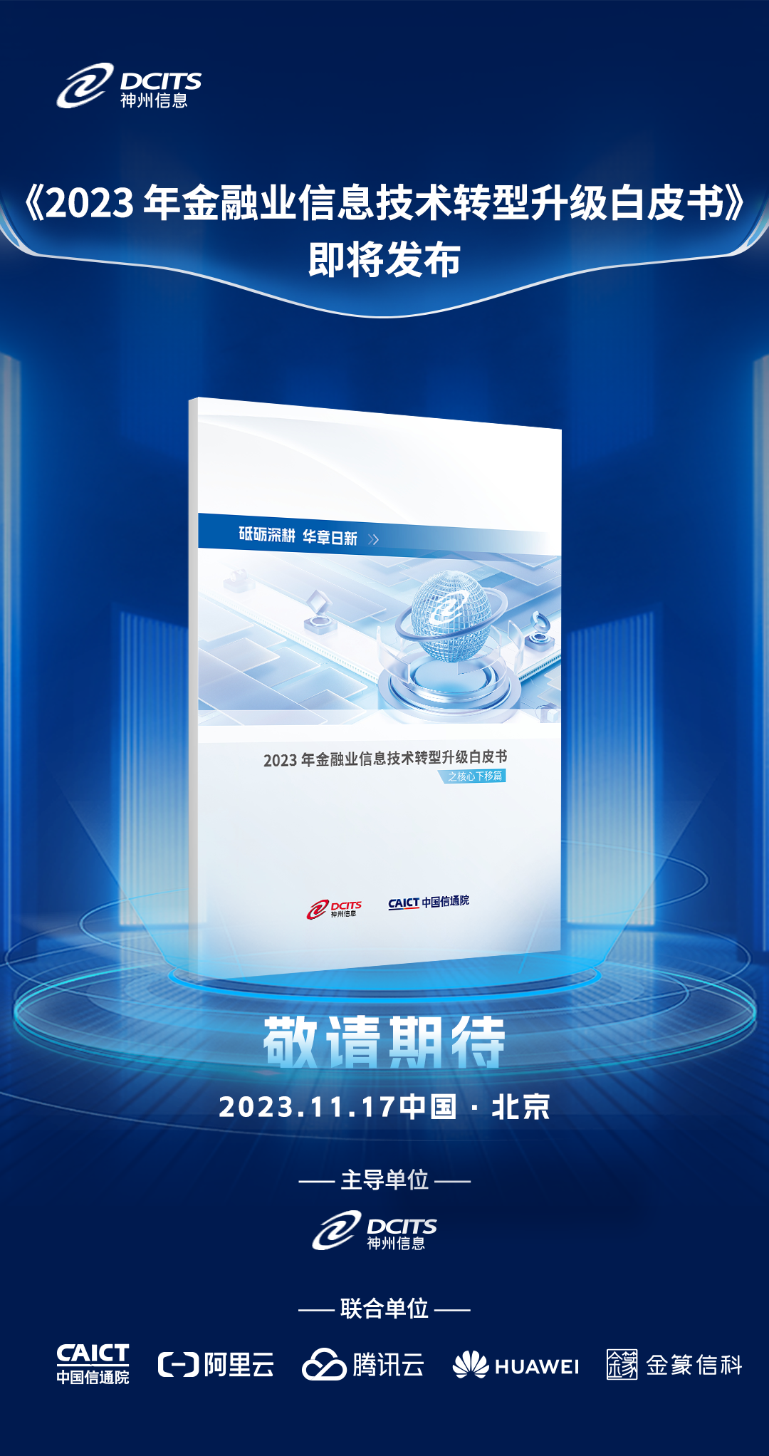 11月17日,神州信息將聯合中國信通院發布《砥礪深耕,華章日新—2023年金融業信息技術轉型升級白皮書之核心下移篇》,敬請期待。