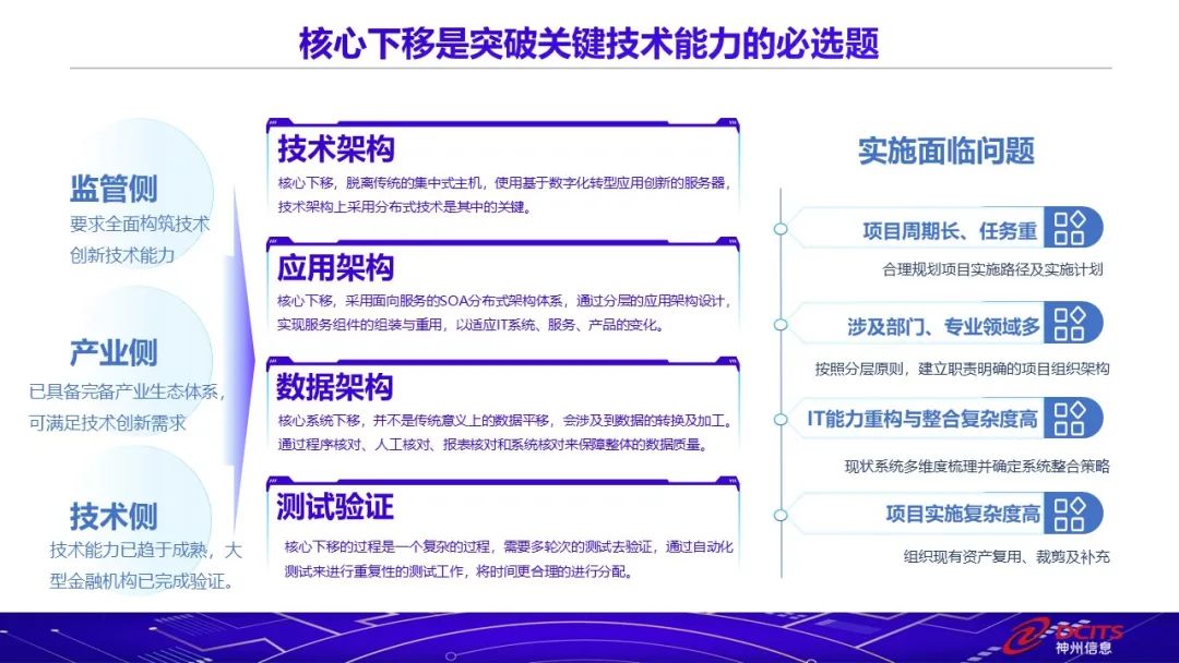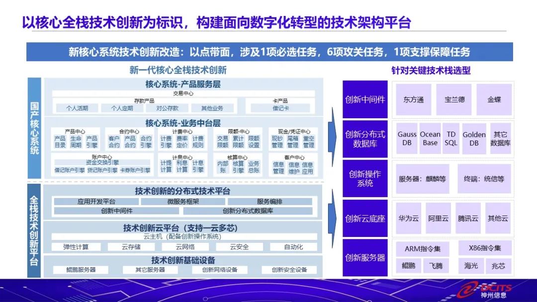 在監管側、產業側、技術側的多方促進下,核心下移已成為突破關鍵技術能力的必選題。金融行業多通過分布式技術平臺進行核心系統升級,神州信息推出的組件化云原生金融技術平臺“九天攬月”,是一套基于主流分布式技術架構松耦合的微服務核心系統,可支持高并發、高可用,云原生、單元化及多云環境部署,通過技術架構和應用架構升級,賦能核心系統全面升級。未來神州信息將以全新核心全棧技術創新為標識,構建面向數字化轉型的技術架構平臺。