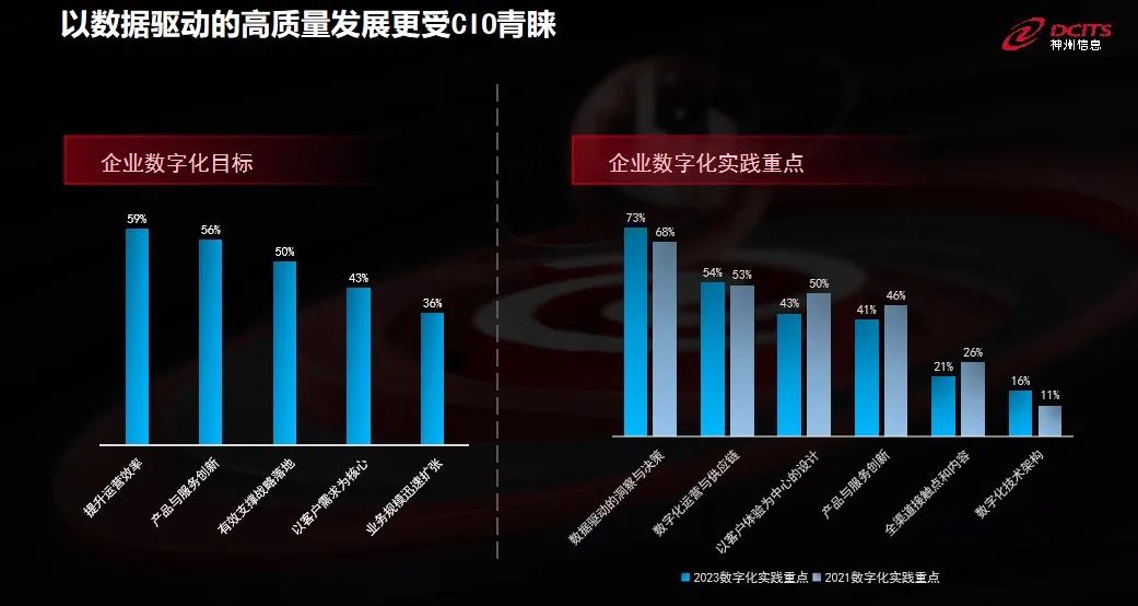 戴可提到,在紅杉中國的一份調研報告顯示,提升運營效率、產品服務創新以及整個企業戰略的落地、數字化具體執行,還有像看到以客戶體驗超過了對業務規模拓展這樣的訴求。此外,約73%的企業將“數據驅動的洞察與決策”作為企業數字化實踐重點來對待,可見,以數據驅動的高質量發展更受CIO青睞。