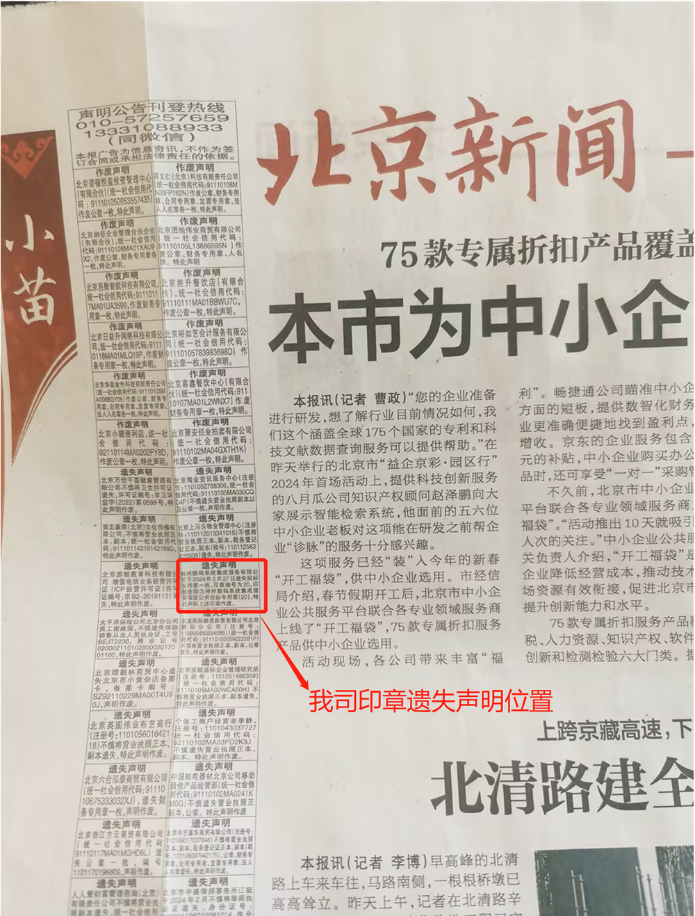 以上聲明內容已在2024年3月2日期的北京日報上同步刊登(下已附圖),如有撿拾到上述印章的,可聯(lián)系我司接口人張夢(15590855018)予以歸還!望周知!
