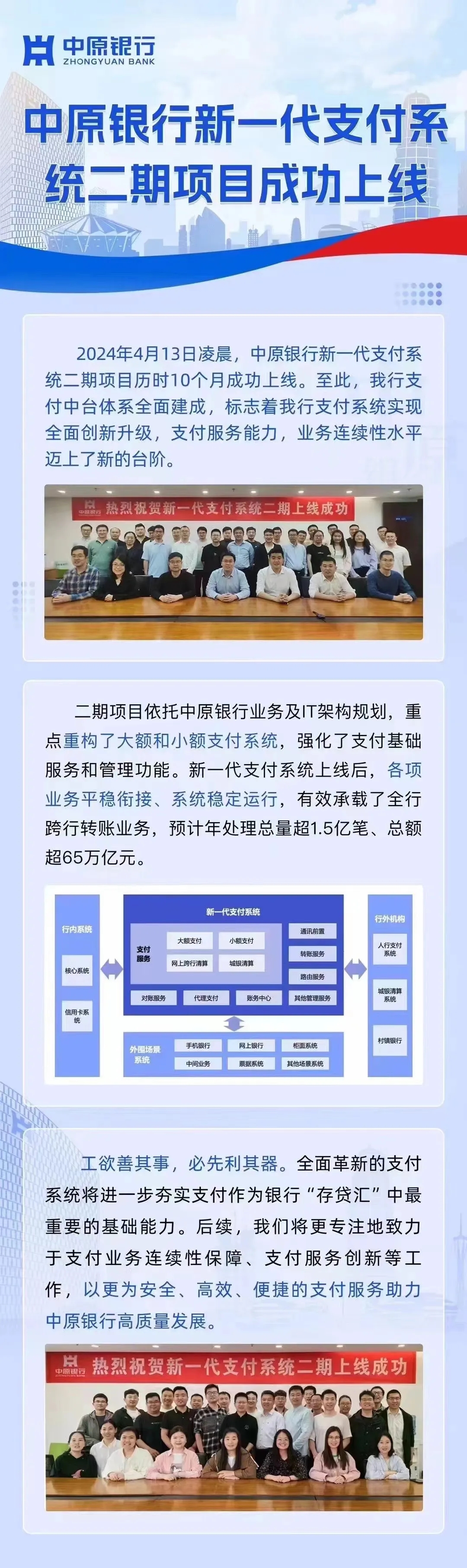 熱烈祝賀中原銀行新一代支付系統(二期)項目成功上線