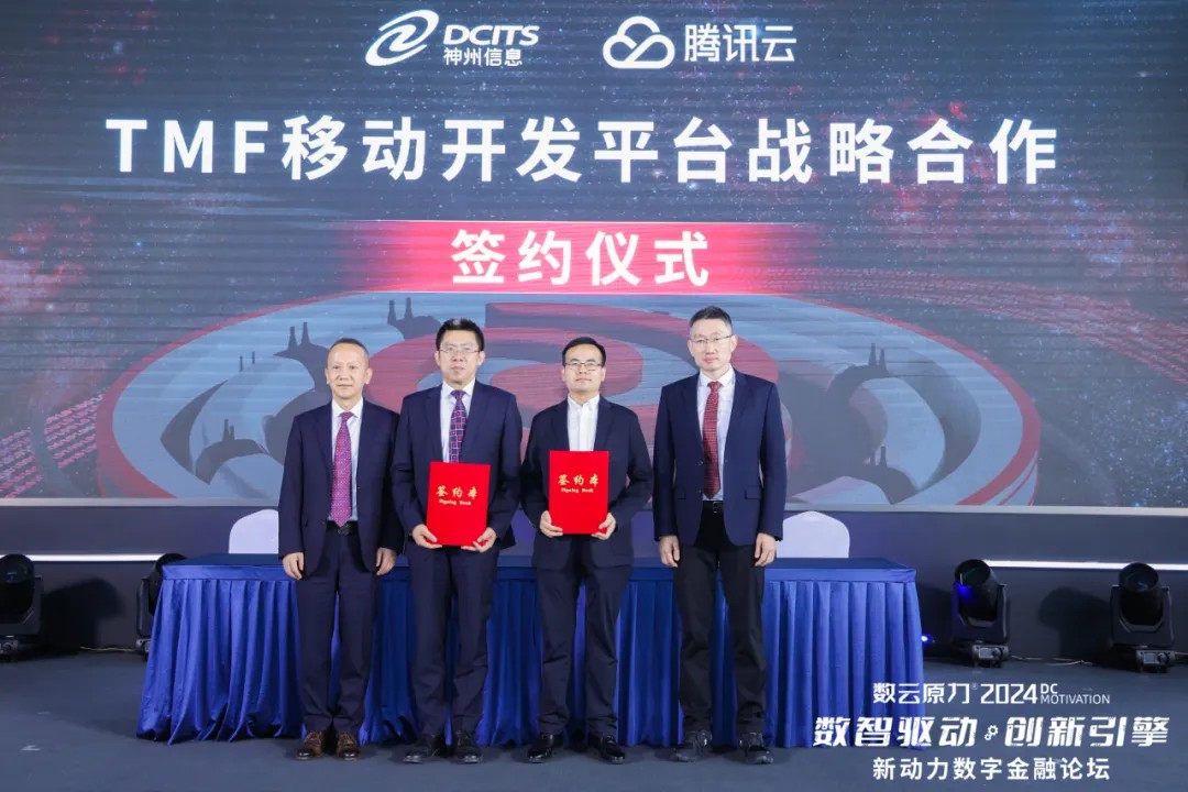 在此背景下,5月15日“2024數(shù)云原力大會·新動力數(shù)字金融論壇”上,神州信息與騰訊云就“TMF移動開發(fā)平臺(簡稱:TMF平臺)”達成戰(zhàn)略合作。神州信息常務副總裁于宏志、騰訊云副總裁胡利明代表雙方簽署協(xié)議,神州信息總裁李鴻春、騰訊公司副總裁、騰訊云與智慧產業(yè)事業(yè)群COO、騰訊云總裁邱躍鵬共同見證簽約。